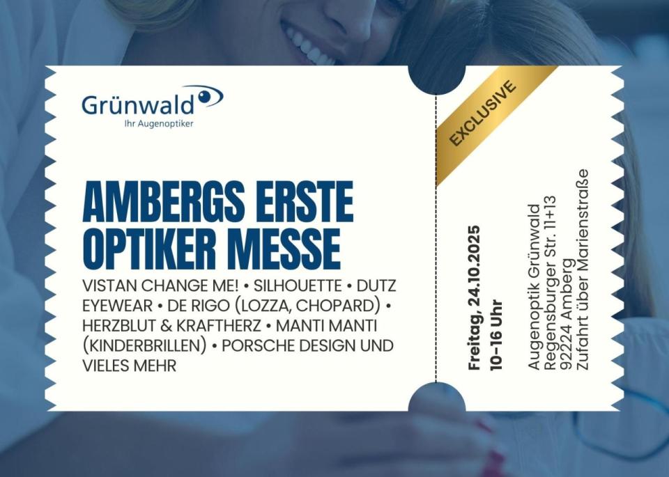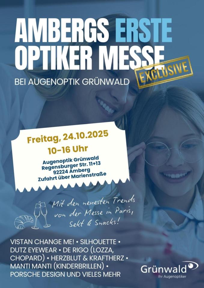 Ambergs erste Optiker-Messe steht vor der Tür! Am Freitag, 24.10.2025, von 10 bis 16 Uhr verwandelt sich das Geschäft von Optik Grünwald in Amberg, Regensburger Straße 11+13, in ein echtes Brillen-Paradies!