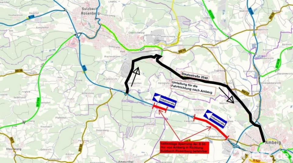 Für die Gegenrichtung von Sulzbach-Rosenberg nach Amberg wird ab der Kreisstraße AS 35 (Europastraße) über die Staatsstraße 2040 eine Umleitung nach Amberg eingerichtet.