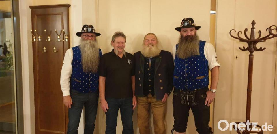 Sebastian Horst, Zweiter Beisitzer des Ostbayerische Bart- und Schnauzerclubs (von rechts), gratuliert Fritz Sendlhofer zu 20 Jahren Mitgliedschaft, ´der dafür extra aus Zell am See in Österreich angereist ist. Ebenfalls auf dem Bild: Ehrenmitglied Josef Nerb und Ehrenpräsident Willi Preuß.