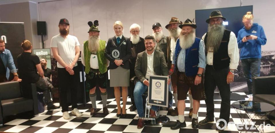So begann der Weltrekordversuch von Dan Gregory aus Liverpool, der vor den strengen Augen der eigens aus England angereisten Guinness-Verlag-Jurorin mindestens acht Bärte in 60 Minuten trimmen musste. Nach einer Stunde hatte Dan zehn Bärte getrimmt, von denen einer nicht in die Wertung kam. Damit zählten neun und der Weltrekord im Barttrimmen war mit Hilfe der Bärte des Ostbayerischen Bartclubs neu aufgestellt. So konnte Dan Gregory die Urkunde entsprechend in Empfang nehmen.