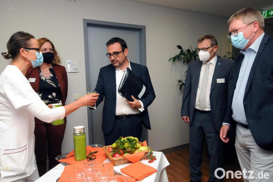 Die bei Bundes- und Landespolitikern fast schon obligatorische Verspätung von einer Viertelstunde oder noch mehr nahm Klaus Holetschek (CSU) am frühen Mittwochnachmittag in Amberg nicht für sich in Anspruch. Pünktlich erschien Bayerns Gesundheitsminister in Begleitung des Landtagsabgeordneten Harald Schwartz, der den Besuch organisiert hatte, im Klinikum St. Marien. Dort gönnte er sich zunächst einen grünen Smoothie, den Elisabeth Gaulard-Hirth, Fachberaterin für ganzheitliche Ernährung und Gesundheit, mit ihrem Team als Willkommensgruß vorbereitet hatte. Danach ging es im Konferenzraum aber schnell ans Eingemachte, denn Klinikumsvorstand Manfred Wendl und Ärztlicher Direktor Harald Hollnberger hatten einige dringende Bitten und Appelle, die sie formulieren wollten. In allen Fällen ging es um die Leistungen, Errungenschaften, Sorgen und Nöte des Klinikums. Und damit zwangsläufig auch um Geld.