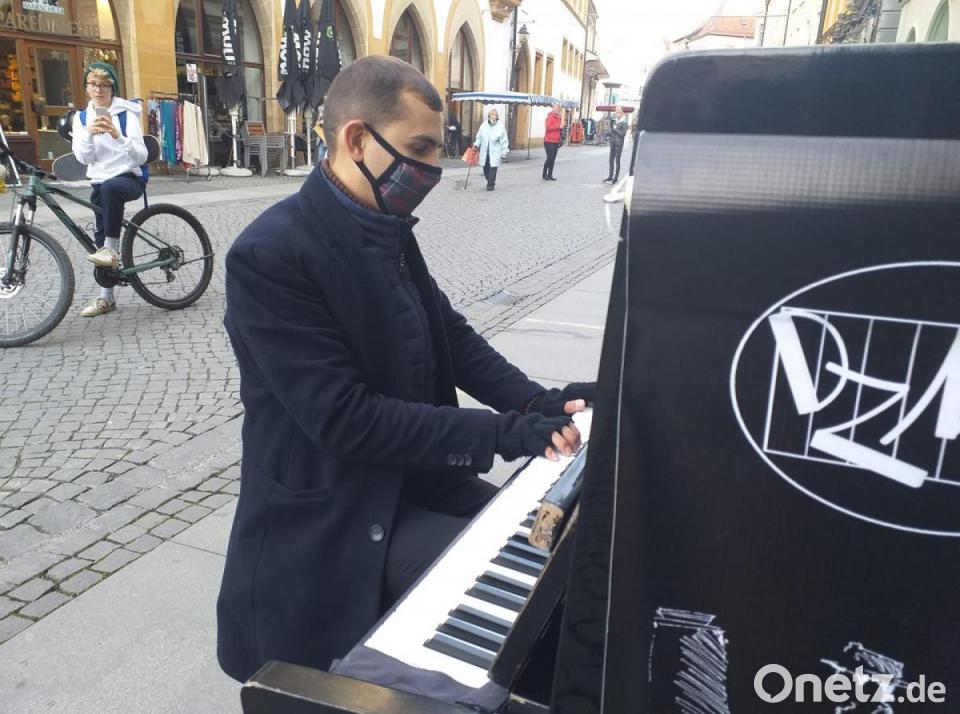 Der junge Mann mit dem langen, dunklen Mantel, den schwarzen Handschuhen und der stilvollen Maske zieht die Blicke in der Fußgängerzone auf sich. Doch das liegt weniger an seinem Aussehen als an der Tatsache, dass er unweit des Rathauses vor einem Piano sitzt und klassische Musik zum Besten gibt. Werke von Chopin zum Beispiel oder die bekannte Filmmusik aus "Fluch der Karibik". Dmitry Horbach ist 31 Jahre alt, kommt aus Belarus (Weißrussland) und verdient dort sein Geld als Komponist, Pianist und Arrangeur. Normalerweise. Nicht so in Zeiten von Corona: "Das hier ist im Moment meine einzige Chance, Geld zu verdienen." 2018 und 2019 war er als Musiker beruflich in Nürnberg und Regensburg tätig. Nun hat er sich daran erinnert, dass es in etwa auf halber Strecke "eine schöne kleine Stadt" gibt, in der er sein Glück versuchen möchte: Amberg.
