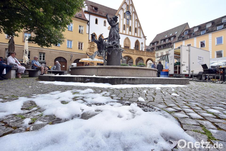Unbekannte haben am Mittwochvormittag etwas in den Brunnen gekippt, mit dem dessen Pumpe Wasser in Schaum verwandelte. So viel davon, dass es aus dem großen Brunnenbecken heraus auf den Marktplatz quoll. Sogar auf der Webcam, die von hoch oben Live-Bilder vom Markplatz liefert, war das zu sehen.