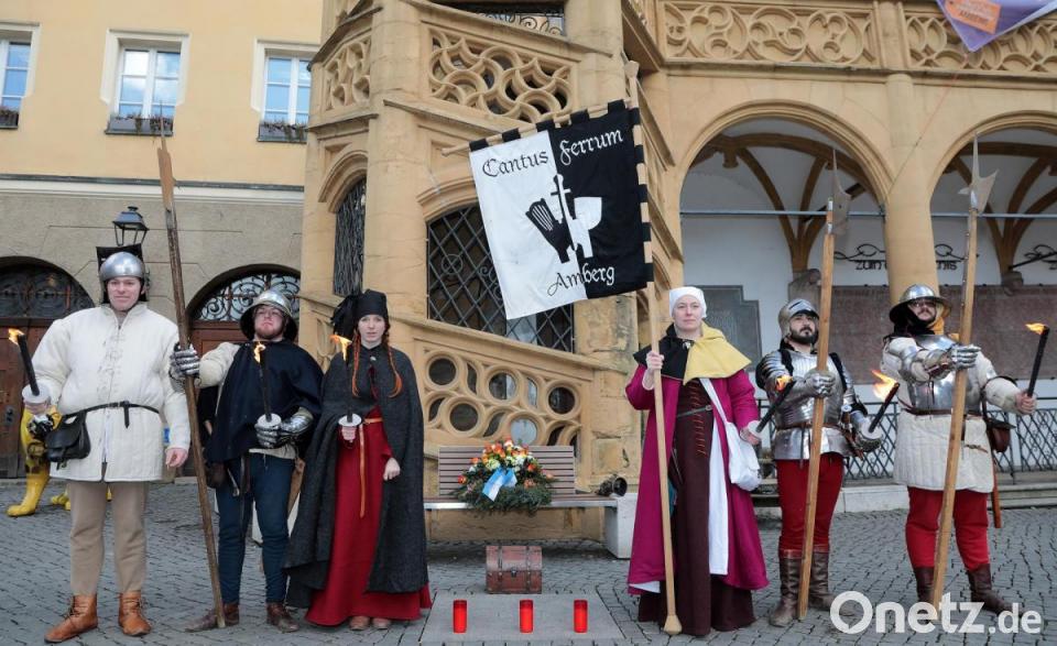 Auf den Tag genau vor 566 Jahren wurden am 5. Februar 1454 drei Männer in Amberg enthauptet. Wo genau, ist nicht belegt, vor dem Rathaus erinnert eine Gedenktafel im Boden an die Hinrichtungen. Cantus Ferrum, der Verein für erlebte Geschichte, gedachte heuer zum zweiten Mal der Vorkommnisse. Bei ihrer Mahnwache legten Mitglieder einen Kranz vor dem Rathaus nieder und zündeten Kerzen an. Der geschichtliche Hintergrund: Nach dem Tod des Kurfürsten Ludwig IV. im Jahre 1449 kam es in der Bevölkerung zu Irritationen um die Erbfolge. Die Treue geschworen hatten die Amberger Ludwigs Sohn Philipp. Als sein Vater starb, war dieser aber erst 13 Monate alt. Onkel Pfalzgraf Friedrich vom Siegreichen übernahm die Vormundschaft und Regierung und sorgte so für Aufruhr. Die Bürger weigerten sich, ihm zu folgen, drohten ihm mit Waffen und beschimpften ihn. Gewaltsam löste Friedrich das Loyalitätsproblem. 1454 stand er mit 1100 Reitern und 2000 Mann Fußvolk vor den Toren Ambergs. Um den Aufstand zu beenden, statuierte er an drei Aufständischen, die er als Rädelsführer ausfindig gemacht hatte, ein Exempel: Er ließ sie köpfen.