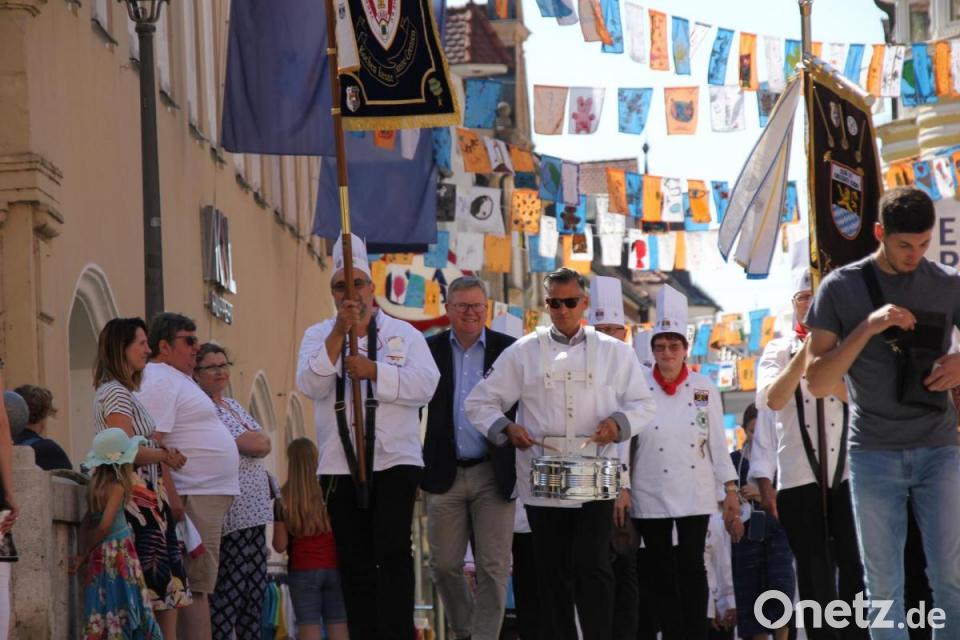 Dass die Zunft zur Kirche steht, zeigte sie dadurch, dass sie im Zug durch Amberg vom Maxplatz zum Marktplatz eine Figur des Laurentius mitführte und als Auftakt eine Festmesse mit Stadtpfarrer Thomas Helm zu Ehren ihres Schutzpatrons in der Basilika St. Martin feierte.