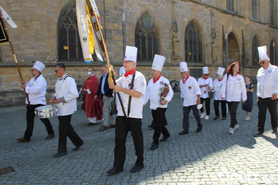 Groß war die Freude bei Michaela Fröhler, dass sie zum Treffen auch Kollegen aus Bayreuth, Nürnberg, Coburg und Bamberg begrüßen konnte. Auch Oberbürgermeister Michael Cerny zeigte Präsenz und begleitete die Köche auf dem Zug zum Marktplatz. Dort wurden sie am Rathaus von Stadtpfarrer Thomas Helm zur Festmesse abgeholt und in die Basilika begleitet. Die Köche selbst trugen die Lesung und ihre selbst verfassten Fürbitten vor. Die musikalische Gestaltung übernahmen Regionalkantor Bernhard Müllers an der Orgel und Sängerin Melanie Dotzler.