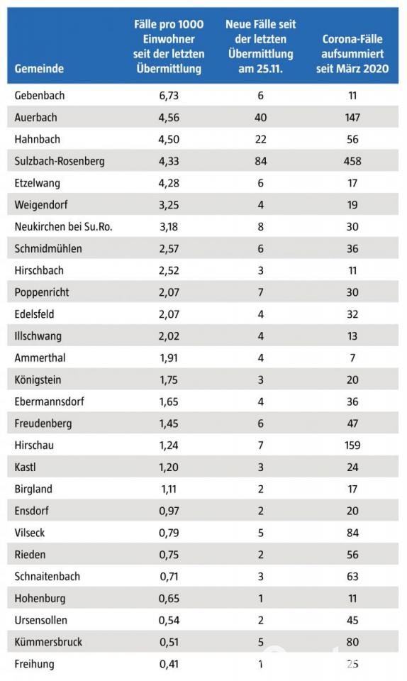 Doch zurück zu den aktuellen Zahlen: Zwischen 25. November und 3. Dezember sind in allen Gemeinden neue Coronafälle hinzugekommen. Einmal mehr wurden für die Stadt Sulzbach-Rosenberg die meisten neuen Coronafälle (+84) notiert. 40 neue Fälle gab es zudem in der Stadt Auerbach, heißt es in der Pressemitteilung aus dem Landratsamt.