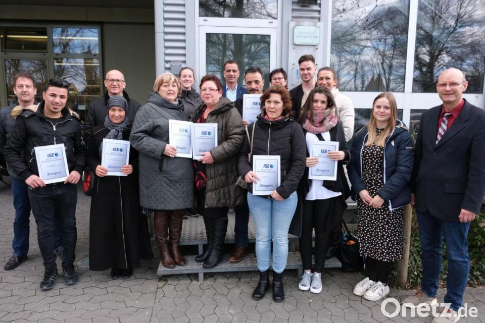 Die Basis für rasche Integration ins Berufs- und Gesellschaftsleben ihres Gastlandes legten die zugezogenen Männer und Frauen im Kurs „Fokus – Beruf und Arbeit“ am Sprach- und Berufsbildungszentrum ISE. Zur erfolgreichen Teilnahme gratulierten die Vertreter des Jobcenters, Rainer Liermann (links hinten) und Ralf Doschat (vorne rechts), sowie die ISE-Lehrkräfte.