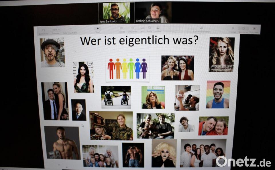 Wer bin ich? Als multidimensionaler Mensch bezeichnet sich Bankwitz. Dennoch gab er während der Präsentation einen kleinen Einblick: „Ich bin ein schwuler, weißer Mann, ein Onkel, spiele Piano und backe gern.“ Für Schuchardt würde er sich jedoch zu sehr reduzieren und leitete in die Begriffe der Fremdwahrnehmung und das eigentliche Ich ein. „Wir haben alle viele Identitäten.“ Sie würde sich als erstes als Bildungsreferentin und Demokratiepädagogin vorstellen, ergo ihrer beruflichen Identität. Um die eigene Wahrnehmung und die von anderen weiter auszuführen, stellten die Referenten Menschen des öffentlichen Interesses vor. Von Conchita Wurst bis zur ersten Transfrau in der Bundeswehr. „Man wird ja nicht als Mann geboren, sondern zum Mann gemacht“, erklärten sie. Um diese Behauptung zu verdeutlichen, erläuterten sie den Unterschied zwischen Gender und Sex. Während es sich bei dem Begriff „Sex“ um das biologische Geschlecht bei der Geburt handelt, ist Gender die Erklärung für das soziale Geschlecht, das durch Kleidung, Beruf, Namen und Interesse ausgedrückt wird.