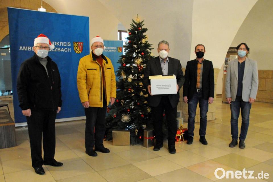 Alle Jahre wieder kurz vor Weihnachten kommen Vertreter des Deutsch-Amerikanischen Gemeinsamen Ausschusses, kurz DAGA, ins Landratsamt Amberg-Sulzbach und übergeben Geschenke. So hatten der deutsche Präsident Helmuth Wächter und James P. Federline auch in diesem Jahr wieder Lebensmittelpakete für sozial schwächere Menschen im Landkreis Amberg-Sulzbach im Gepäck. 50 Pakete, vollgepackt mit Süßigkeiten und Lebensmittel für den täglichen Bedarf, durften Landrat Richard Reisinger, Abteilungsleiter Norbert Vogel und Sachgebietsleiter Georg Jobst von der Sozialhilfeverwaltung am Landratsamt jetzt entgegen nehmen.