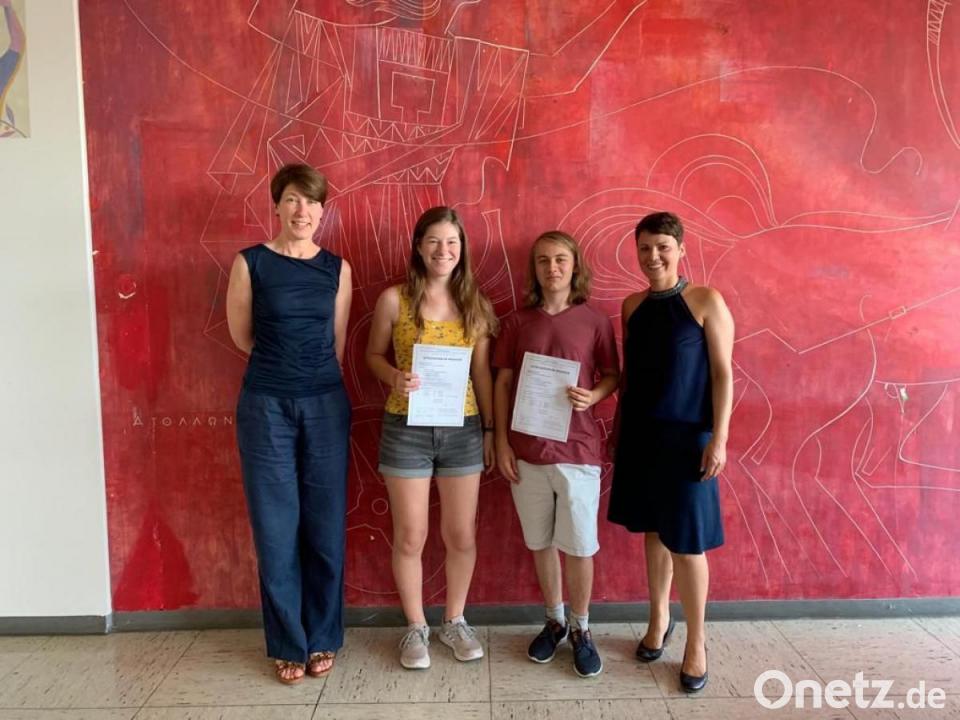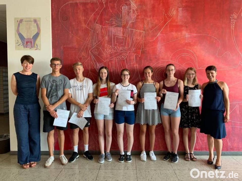Das Diplôme d'Études de la Langue Française, kurz DELF, ist ein international anerkanntes Sprachzertifikat des französischen Kultusministeriums, das Fremdsprachenkenntnisse auf verschiedenen Niveaustufen nachweist. Es ist ein Leben lang gültig. Auch heuer haben besonders leistungsstarke Erasmus-Gymnasiasten die Möglichkeit genutzt, den Nachweis, bestehend aus Hörverstehen, Leseverstehen, Textproduktion und mündlicher Prüfung, zu erwerben: Für das Niveau B1 stellten sich Hannah Auernhammer, Leonie Berndt, Jana Jüntgen, Anna Meckl, Nicole Ott, Leon Pollok und Janis Stigler (alle 10 b) der Prüfung. An das noch höhere B2-Niveau wagten sich Franziska Lehnert und Manuel Pfitzner (beide 11. Klasse) sowie Sebastian Schürfeld aus der 12. Klasse. Nun kam die gute Nachricht aus Paris: Alle haben bestanden.