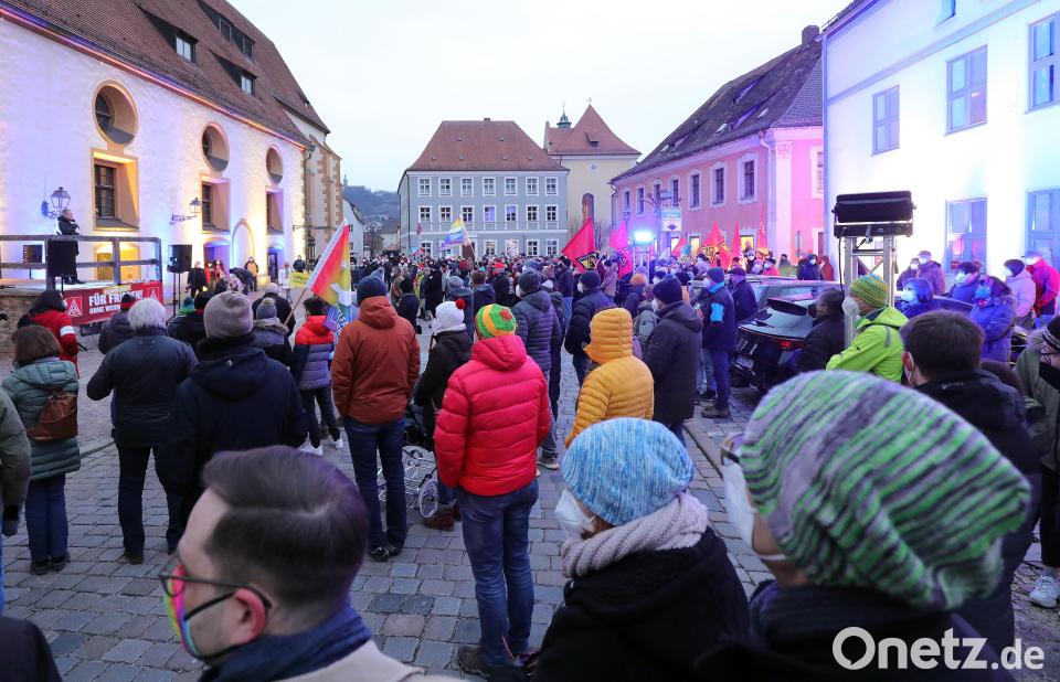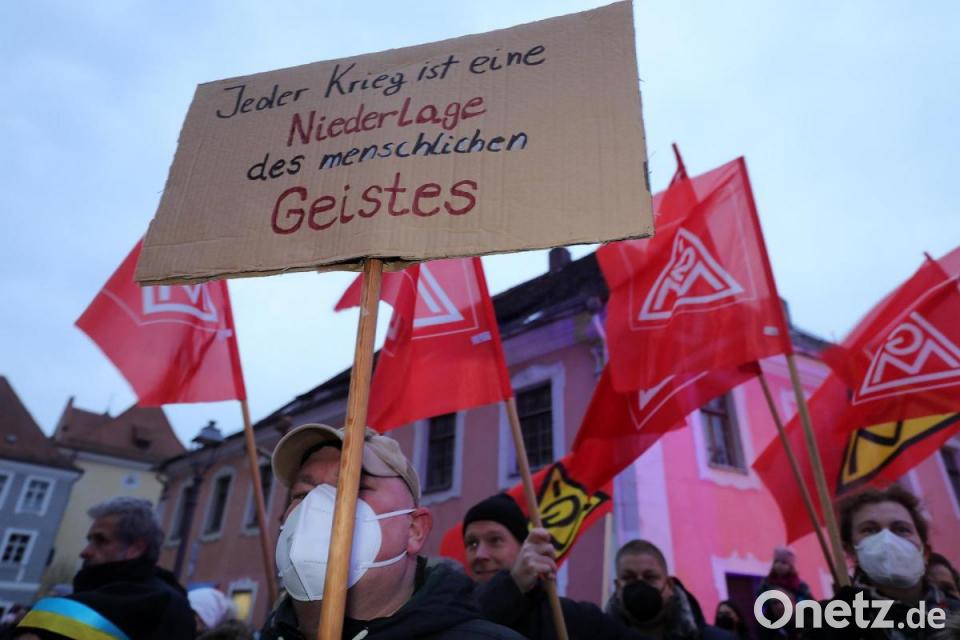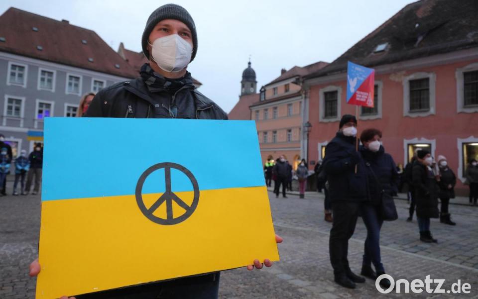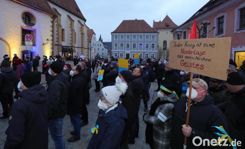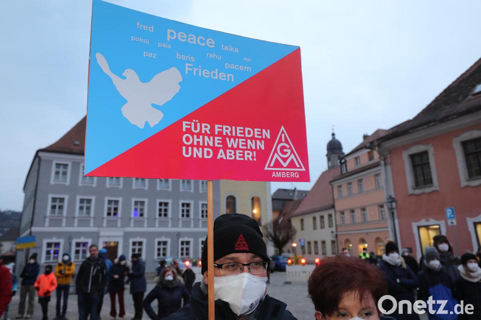 Sonntagabend, die Temperaturen um den Gefrierpunkt, das Stadttheater getaucht in die Farben Blau und Gelb. Rund 250 Menschen, teils mit Bannern, teils mit Plakaten, haben sich am Schrannenplatz versammelt, um ein Zeichen der Solidarität zu setzen und gegen den russischen Angriffskrieg auf die Ukraine zu protestieren. Einer der Teilnehmer hatte ein Schild mit den Worten "Jeder Krieg ist eine Niederlage des menschlichen Geistes" bei sich. Ein anderer trug die ukrainische Nationalflagge mit einem großen Peace-Zeichen in der Mitte. Horst Ott, der Erste Bevollmächtigte der Amberger IG-Metall (IGM), hat die Kundgebung zusammen mit seinem Team auf die Beine gestellt. Mit ihm auf der Bühne standen der Bezirksleiter der bayerischen IGM, Johann Horn, der extra für die Mahnwache nach Amberg gereist war, und Ambergs Oberbürgermeister Michael Cerny.