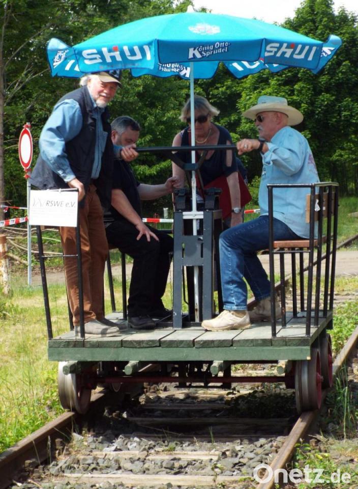Unabhängig davon gab's reichlich Gelegenheit, sich Eindrücke aus der Welt der Eisenbahn zu verschaffen. So gab es eine Kleinbahn mit fünfeinhalb Zoll-Spur für die Kleinen, eine Feldbahn mit Personenbeförderung (600 Millimeter Spurweite) und außerdem eine Handhebel-Draisine.