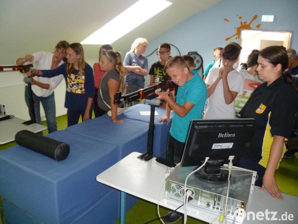 Gänge und Klassenzimmer wurden zu Ausstellungs- und Demonstrationszwecken umgenutzt. Wer wollte, durfte auch in der arabischen Schrift üben. Dass das künstlerische Element an dieser Schule einen gewissen Schwerpunkt bildete, lag nahe. So luden ein Kalligraphie- und ein Kunstworkshop zum Mitmachen ein. Bei der Gestaltung des längsten Amberger Bildes griffen auch die Erwachsenen zu Farbe und Pinsel. Besondere Fertigkeiten beim T-Shirt-Bedrucken oder Schlüsselanhängerbasteln demonstrierten die Schüler ebenso wie Treffsicherheit beim von der Feuerschützengesellschaft angebotenen Schießen mit Luftgewehr und Luftpistole mit Lasertechnik.