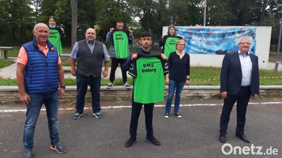 Zum Schulbeginn erreichte die Dreifaltigkeits-Mittelschule eine freudige Nachricht: beim "Trikottag" des Bayerischen Landessportverbandes (BLSV) zählt die Schule bei mehr als 300 Einsendungen als einziger Oberpfälzer Teilnehmer zu den 30 Preisträgern. Dies nahm stellvertretender BLSV-Kreisvorsitzender Erich Dömel zum Anlass, einen Satz Trikots mit Hosen persönlich zu überreichen. Am "Trikottag" ruft der BLSV Kinder dazu auf, sich die Vereinskleidung überzustreifen und so zur Schule zu gehen. "Die vielen Einsendungen zeigen kleine und große Vereinssportler in Alltagssituationen - wie etwa beim Flötenunterricht, beim Friseur oder im Getränkemarkt, im Präsenzunterricht sowie im Homeschooling", erzählte Dömel. "Man sieht den Kindern die große Freude darüber an, nach dem Lockdown wieder mit Freunden zu spielen und zu sporteln. Die Dreifaltigkeitsschule bewarb sich mit einem Foto, auf dem die Schüler den Schriftzug "halts zam" nachstellten, dazu knieten mit erhobener Hand einige Schüler mit Migrationshintergrund, um ein Zeichen gegen Rassismus zu setzen.
