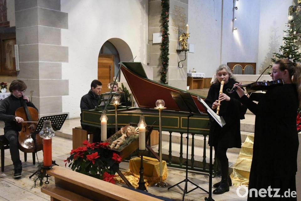 Danach versammelte sich das Ensemble vor dem Altar um die Krippe. Von hier ertönte festliche Kammermusik. Schön fügten sich Blasinstrument, Streicher und Tasteninstrument zusammen. Solistisch bot Farnbauer eine Improvisation am Cembalo dar. Zum Schluss sangen alle "O du fröhliche".