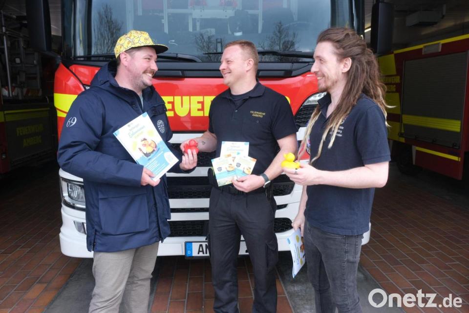 Beim jährlichen Entenrennen von Round Table 69 Amberg gehen neben tausenden kleinen Plastikenten auch Ehrenenten an den Start. Diese Ehrenenten würdigen das Engagement externer Helfer, wie die Organisatoren mitteilen. In der Feuerwache der Freiwilligen Feuerwehr Amberg übergaben RT-Schatzmeister Stefan Fuchs und Webmaster Julian Ellmaier eine rote Ente mit der symbolischen Startnummer 112 an Stadtbrandmeister Sebastian Schindler. Schindler ist aktuell im vorbeugenden Brandschutz engagiert. Die Amberger Feuerwehr war viele Jahre ein unentbehrlicher Helfer am Zieleinlauf des Entenrennens.
