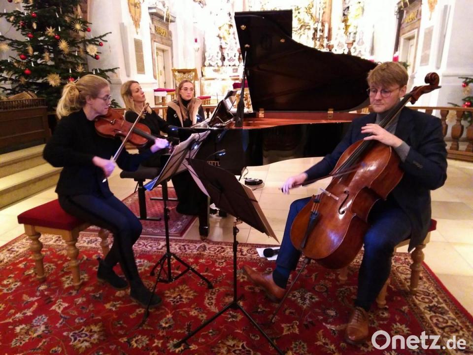 Wolfgang Amadeus Mozarts Klaviertrio in C-Dur aus dem Jahr 1788 brachte "Engelsstimmen" ins barocke Kirchenschiff und begann heiter und beschwingt. Auch der leicht melancholische Schleier im Mittelteil löste sich in bestimmender Rhythmik und innig vergnügt auf.