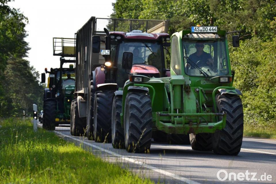 Vom Haidweiher aus setzte sich am frühen Freitagabend ein Protestzug von Landwirten in Bewegung. Mit einem Teleskop-Lader vornweg Jürgen Donhauser aus Moos (Gemeinde Kümmersbruck), der mit seinen Söhnen Josef und Simon einen Schweinezucht- und Mastbetrieb betreibt. Weil ihm die aktuelle Rolle der Politik missfällt, hatte Donhauser senior im Laufe des Tages per Whatsapp-Nachrichten Kollegen aufgefordert, ihm nach Schwarzenfeld (Kreis Schwandorf) zu folgen, um dort ein Eis zu essen. Hintergrund der Aktion: Die neue Nutztierhaltungsverordnung, die seit einer Woche gilt, schreibt vor, dass die Bedingungen in den Ställen geändert werden müssen. Bei den Sauen hat es laut Donhauser bisher keine exakten Vorgaben gegeben, wie viel Platz die Tiere haben müssen: "Das war eher etwas schwammig formuliert." Seine Söhne und er hätten sich schon vor geraumer Zeit auf erlaubte 5,5 Quadratmeter verständigt, die neuen Vorgaben sehen aber nun 6,5 Quadratmeter vor. Für Donhauser ein Problem - und für viele der Kollegen auch, wie er sagt: "Spätestens in drei Jahren müssen wir mitteilen, ob wir umbauen oder neu bauen."