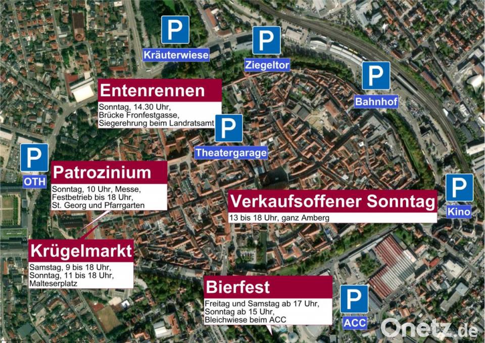 Im Anschluss an den Besuch im Pfarr-Biergarten bietet sich eine Shopping-Tour durch die Amberger Altstadt an. Denn der 28. April hat auch für die Händler eine besondere Bedeutung: Am verkaufsoffenen Sonntag haben viele Geschäfte in der ganzen Stadt von 13 bis 18 Uhr geöffnet. Eine Veranstaltung, an der am Sonntag sicher keiner vorbeikommt, der in der Stadt unterwegs ist, ist das Entenrennen. Organisiert wird es wieder vom Serviceclub Round-Table 69. Für einen guten Zweck gehen rund 3 000 bunte Plastik-Entchen und etwa 2 000 Enten-Küken an den Start. Los geht es um 14.30 Uhr auf der Brücke in der Fronfestgasse. Von dort aus schwimmen die Enten die Vils entlang durch die Altstadt in Richtung Stadtbrille. Die Siegerehrung ist für 16 Uhr im Innenhof des Landratsamts geplant. Auch dort gibt es Bewirtung und Live-Musik. Wie das Wetter an diesem Wochenende in Amberg werden wird, verrät Wetterexperte Andy Neumaier: "Der Freitag beginnt zwar noch ganz Okay mit Sonne und Temperaturen bis zu 20 Grad. Im Tagesverlauf kommen aber Schauer und Gewitter mit Windböen auf. Dann wird es im Laufe des Nachmittags immer kälter." Am Samstag wird es allerdings ungemütlicher: "Häufige Schauer - die Natur braucht das, das Festwochenende halt leider nicht." Bei 10 bis 13 Grad müssen sich die Bierfest- und Krügelmarkt-Besucher ein wenig wärmer anziehen. Gute Neuigkeiten hält Neumaier für den Endspurt des Wochenendes bereit: "Am Sonntag tut sich voraussichtlich ein Zwischenhoch bei mehr Sonne, meist trockenem Wetter und rund 15 Grad auf."