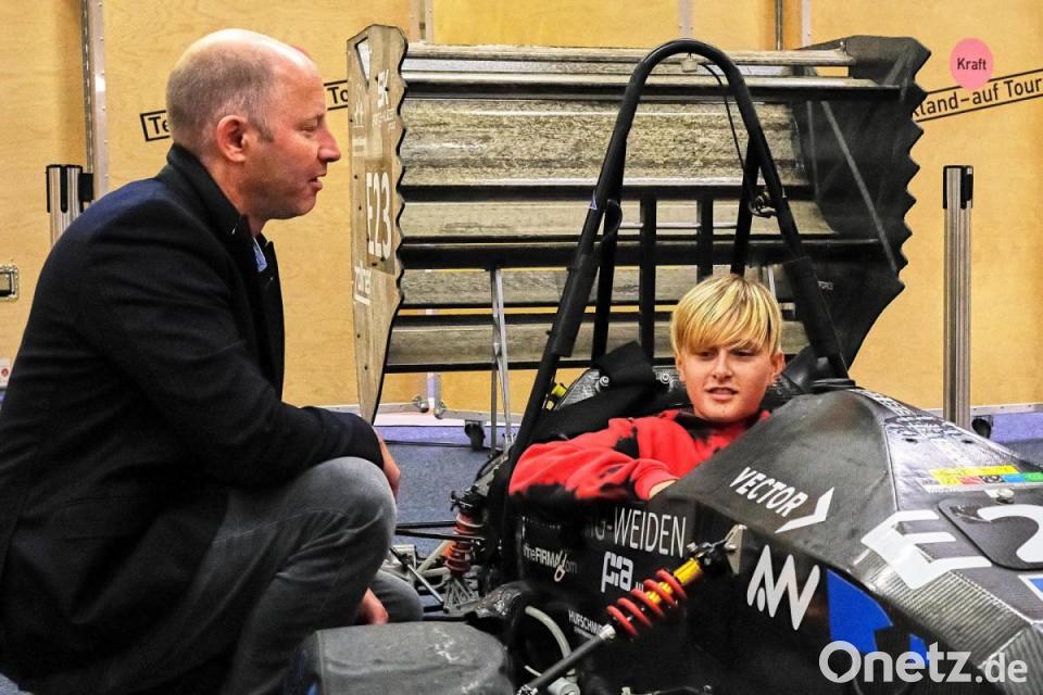 Als Zweiter wandte sich Prof. Dr.-Ing. Michael Wensing (Vorstand Förderkreis Ingenieurstudium e. V.) an die Klasse 8a. Er betonte, dass die Ausstellung zeige, wie man technische Phänomene verstehen könne. Alles ist so angelegt, dass man selbst Hand anlegen kann, um etwas auszuprobieren oder einen Vorgang zu starten; zusätzlich gibt es zu jeder Experimentierstation eine Erläuterung zu lesen. Als Beispiel dafür, wie Eigeninitiative und Engagement etwas bewegen, führte er den Rennwagen an, den das „Running Snail Racing Team“, bestehend aus Studenten der OTH Amberg-Weiden, selbst entwickelt und hergestellt hat.