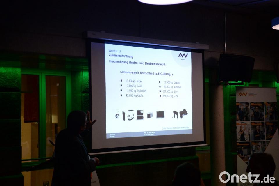 Zum anderen war Ralf Fischer von Siemens aus Nürnberg in Amberg, um über elektrische Antriebe und deren Chance für eine neue Energieeffizienz zu informieren. Auf das Thema Recycling ging Ambergs MBUT-Professor Mario Mocker genauer ein, explizit auf den Punkt: Was wird aus alten Handys? Seine Eröffnungsfrage: "Recycling bei Handys ist ja so nen Sache. Ehrlich in die Runde gefragt, wer hat denn mehr als zwei alte Handys bei sich noch zu Hause in den Schubladen liegen?" Viele Menschen. Das zeigte die Resonanz der Veranstaltungsteilnehmer und eine Zahl, die Mocker hierzu parat hatte: "Derzeit geht man davon aus, dass 124 Millionen alte Handys im Umlauf sind." Ferner ist die Separierung von alten Handys ein Problem. "Wenn wir ehrlich sind, fliegt der Elektroschrott einfach in den Hausmüll, das ist am einfachsten", bilanzierte er. Für die Zukunft sieht Mocker aber große Chancen. "50 einzelne Elemente können aus einem Handy zurückgewonnen werden. Nach derzeitigem Stand der Technik sind es davon aktuell nur 17."