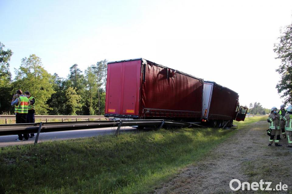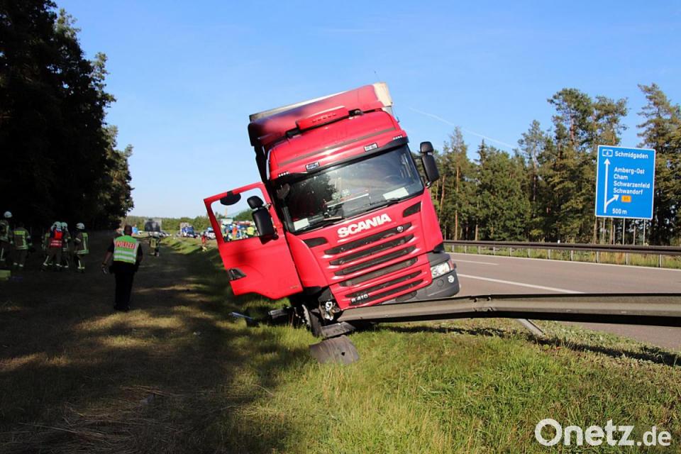 Auf der Autobahn 6 zwischen den Anschlussstellen Amberg Ost und Amberg Süd ist am Mittwoch, 22. Juli, gegen 17.25 Uhr ein Lastwagen alleinbeteiligt verunglückt. Der Sattelzug war mit Waschmaschinen beladen in Richtung Nürnberg unterwegs. Polizeiangaben zufolge kam der Fahrer mit seinem Lkw nach rechts von der Fahrbahn ab und kollidierte mit der Leitplanke. "Es ist davon auszugehen, dass er spätestens ab dem ersten Zusammenstoß die Kontrolle über sein Fahrzeug verlor, da er nun über eine Länge von circa 500 Metern sämtliche Leitplankenfelder niederriss", heißt es dazu im Polizeibericht. "Durch die Wucht des Aufpralls verkeilte sich der Lkw mit den Leitplankenfeldern, kam schließlich am leicht abschüssigen Hang zum Stehen und verlor Betriebsstoffe."