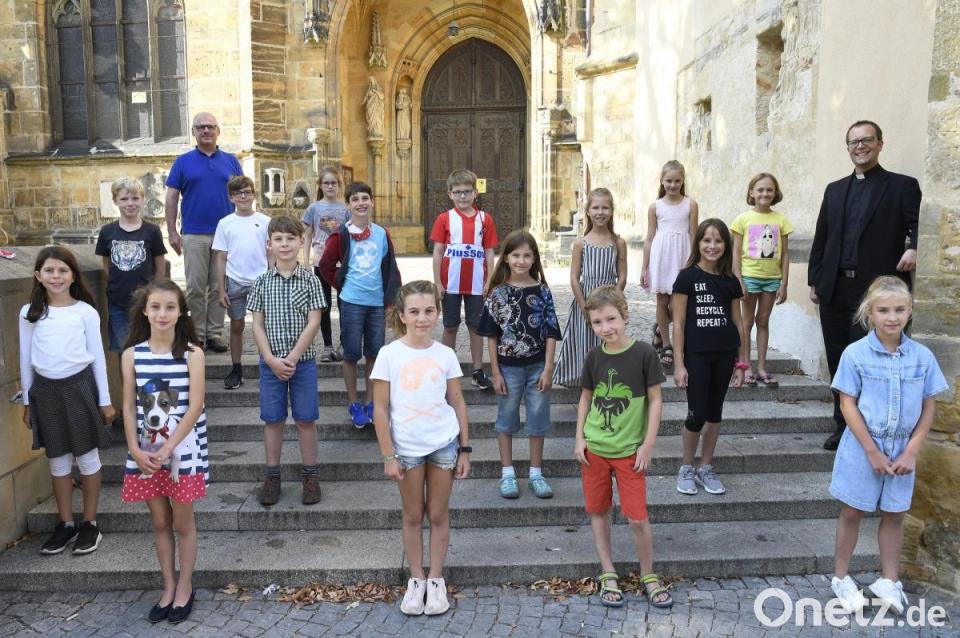 Getrennt in zwei Gruppen und an zwei Tagen durften die Amberger Viertklässler, ein Novum, erstmals zum Tisch des Herrn gehen. Zunächst verschob Pfarrer Thomas Helm den Termin auf Juli, später einigte man sich zusammen mit der Diözese auf eine Feier in St. Martin am 26./27. September. 14 Kommunionkinder kommen aus der Max-Josef-Schule, drei aus der Dreifaltigkeitsschule. Die Kinder aus der Max-Josef-Schule hatte Pfarrer Helm im Unterricht. Für die Buben und Mädchen gab es drei Vorbereitungsnachmittage. In beiden Kommunionfeiern ging Helm in seiner Predigt auf das Thema „Jesus erzähl uns von Gott“ ein, das er an Hand einer von den Kindern selbst gestalteten Schatzkiste Gottes mit symbolischen Inhalt erläuterte. Darin befanden sich eine Bibel und ein Laib Brot als Hinweis auf das letzte Abendmahl. Den Gottesdienst umrahmten Bernhard Müllers (Orgel) und Franz Badura (Trompete). Ein gemeinsames Bild aller Erstkommunikanten von St. Martin in liturgischen Gewändern war heuer nicht möglich. Das Gruppenfoto mit Pfarrer Thomas Helm (zweite Reihe, rechts) und Diakon Richard Sellmeyer (hinten, links) entstand eine Woche vorher auf der Treppe neben der Sakristei.