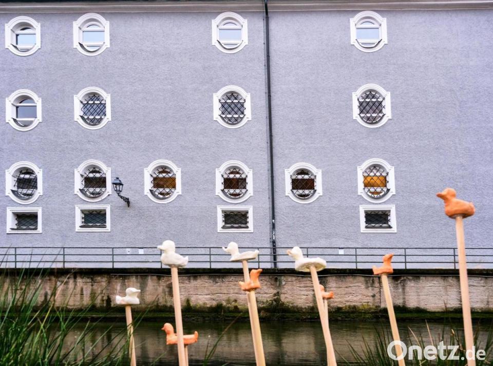 Die Gruppe „Fluss-Kunst“ hatte entlang der Vils eine Open-Air-Galerie installiert. Auf laminierten Bögen waren Reproduktionen von Gemälden am Geländer platziert, die alle thematisch mit dem Wasser zu tun hatten, darunter etliche impressionistische Gemälde, wie etwa von Monet, Renoir oder Sisley. Als Brücke zur Kultur der Gleichaltrigen montierten sie einen aus Ästen gestalteten Bilderrahmen am Lederersteg und forderten Passanten in ihrem Aushang dazu auf, hier ein Selfie zu schießen und es in den sozialen Medien mit dem Hashtag #FlusskunstAmberg zu teilen. Ein weiteres Thema dieser Gruppe war eher verspielter Natur: Die Schülerinnen griffen das Motiv der hier auf der Vils oft anzutreffenden Enten auf und stellten aus hellem und dunklem Ton eine ganze Großfamilie von Enten her, die auf Stöcken in den weichen Ufergrund der Vils gesteckt wurden – eine ganz besondere Gattung von Stockenten.