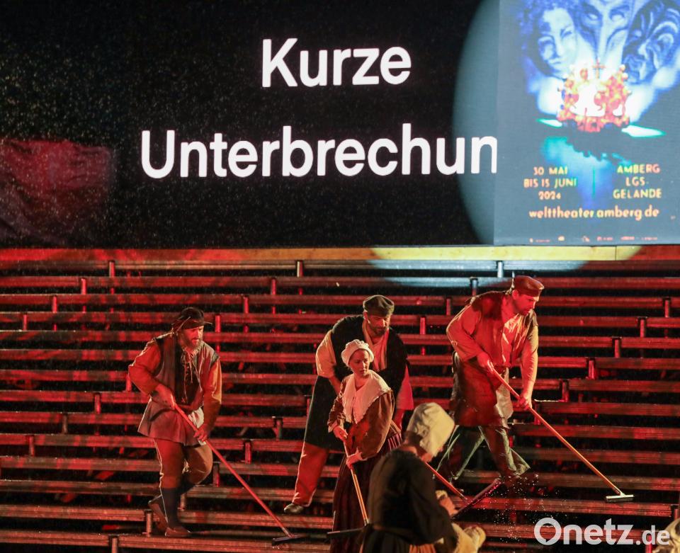 Angekündigt war der Regen, die Macher des Amberger Welttheaters hatten trotzdem gehofft, ihren Spielplan einhalten zu können. Doch zumindest am heutigen Freitag, 31. Mai, geht es nicht: In Amberg regnet es seit dem späten Nachmittag ununterbrochen, außerdem gibt es eine Unwetterwarnung für die Region. Deshalb wurde die Abendvorstellung nun kurzfristig doch abgesagt. Ersatztermin für diesen Auftritt ist Sonntag, 9. Juni. Samstag und Sonntag, 1. und 2. Juni, soll aber gespielt werden. Falls das vom Wetter her nicht möglich sein sollte, würden die Veranstalter dies wieder kurzfristig auf ihrer Internetseite über ihre Social-Media-Kanäle mitteilen.