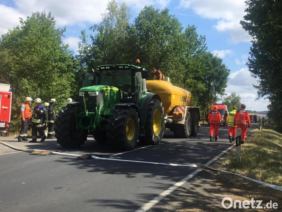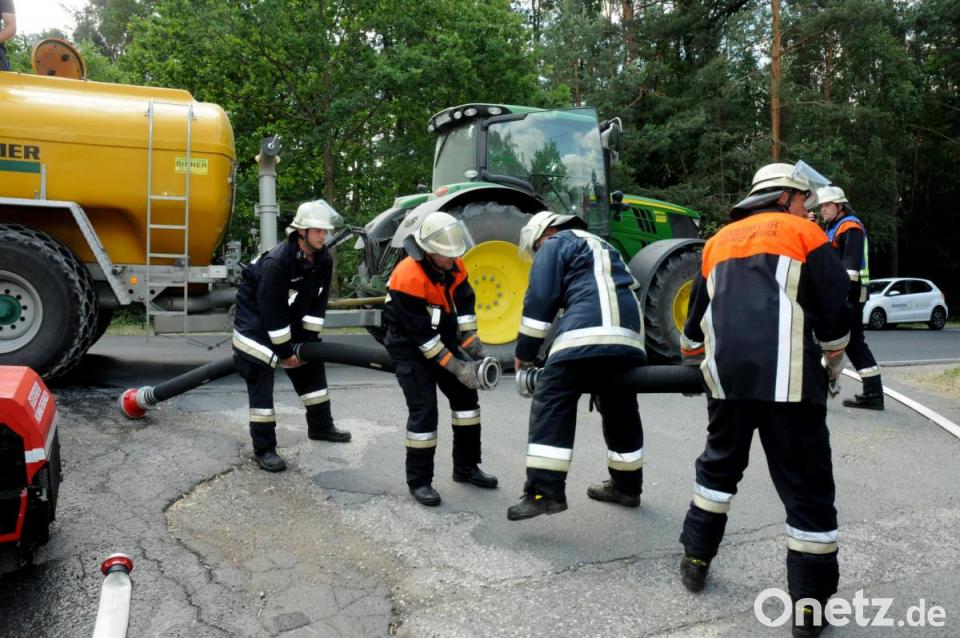 Zusätzlich zu den Löschfahrzeugen, die im Pendelverkehr die Einsatzkräfte an den Brandorten mit Wasser versorgten, schaffte noch Landwirt Sebastian Graf aus Gärmersdorf mit einem Güllefass, das 14 000 Liter fasste, und die Gemeinde Högling mit einem Pumpfass (rund 10 000 Liter) Wasser ran. Über diese Unterstützung zeigte sich Kreisbrandinspektor Hubert Blödt sehr dankbar: „Wir haben alles Wasser genommen, das wir kriegen konnten.“ Ebenfalls vor Ort mit einem Rettungswagen, dessen Besatzung und Michael Honig als Einsatzleiter war das Rote Kreuz zur Absicherung der Feuerwehrleute. Verletzt bei den Löscharbeiten wurde niemand, so Blödt. Das BRK lieferte außerdem Nachschub an Getränken für die Einsatzkräfte.