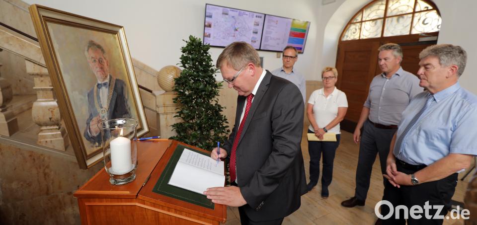 Oberbürgermeister Michael Cerny und seine Referenten trugen sich am Montag in das Kondolenzbuch ein, das im Vorraum des Rathauses für den verstorbenen Alt-OB Franz Prechtl ausliegt. Die Bürger haben ebenfalls die Möglichkeit, auf diese Weise ihre Verbundenheit mit Franz Prechtl zu zeigen und seiner Familie ihr Beileid auszusprechen. Das Buch liegt bis einschließlich Donnerstag, 9. August, im Rathausfoyer direkt am Haupteingang auf. Geöffnet ist das Rathaus am Dienstag und Mittwoch von 8 bis 16 Uhr und am Donnerstag von 8 bis 17 Uhr. Die Trauerfeier für Franz Prechtl findet am Freitag um 12.30 Uhr in der Basilika St. Martin statt. Danach Beerdigung auf dem Katharinenfriedhof.