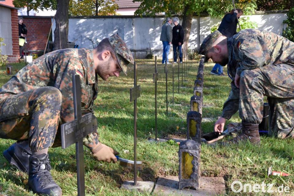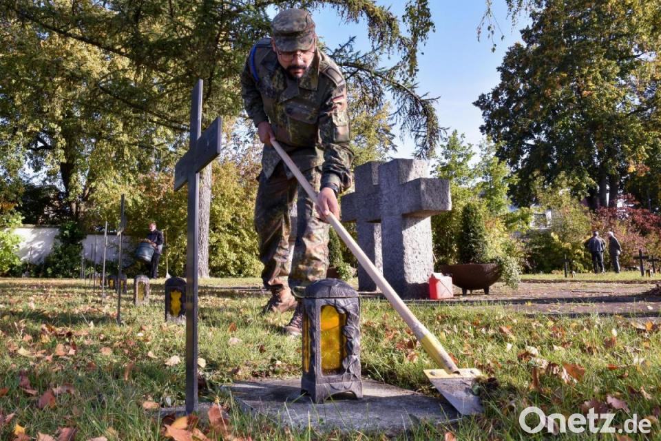 Kaum jemand erinnert sich derer, die hier im Soldatenfriedhof begraben sind. Doch die Kurfürstliche Schlosswache nimmt sich jedes Jahr der Pflege und Instandsetzung der fast 140 Kreuze, Platten und Laternen an. Seit neun Jahren engagieren sich die Mitglieder der Kurfürstlichen Schlosswache dafür, indem sie die Grabkreuze auf dem Soldatenfriedhof im Katharinenfriedhof säubern und einölen. Außerdem kehren sie Laub und Unrat zusammen.