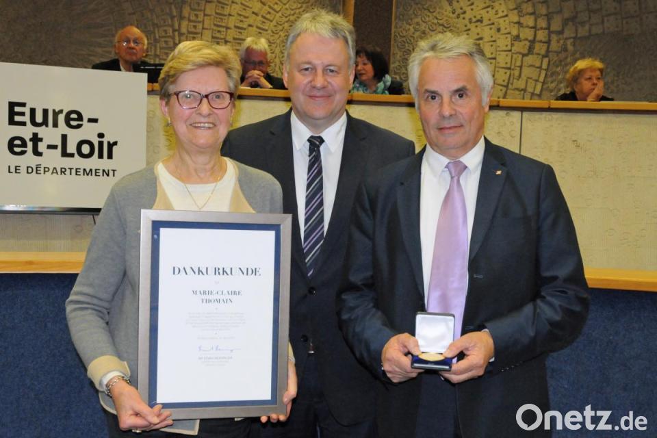 Marie-Claire Thomain stellte nach 21 Jahren ihr Amt als Präsidentin zur Verfügung und läutete damit einen Generationswechsel ein. Landrat Richard Reisinger dankte bei einer Delegationsreise in den Partnerlandkreis südlich von Paris Marie-Claire Thomain für ihr herausragendes Engagement in mehr als zwei Jahrzehnten. Sie sei stets auf der Suche nach einer gemeinsamen Erinnerungskultur und Antworten auf die Zukunft gewesen, betonte Reisinger. Er überreichte der scheidenden Präsidentin eine Dankesurkunde als Zeichen der Wertschätzung und für ihren Einsatz für die freundschaftlichen Beziehungen zwischen den Menschen im Landkreis Amberg-Sulzbach und im Canton Maintenon.