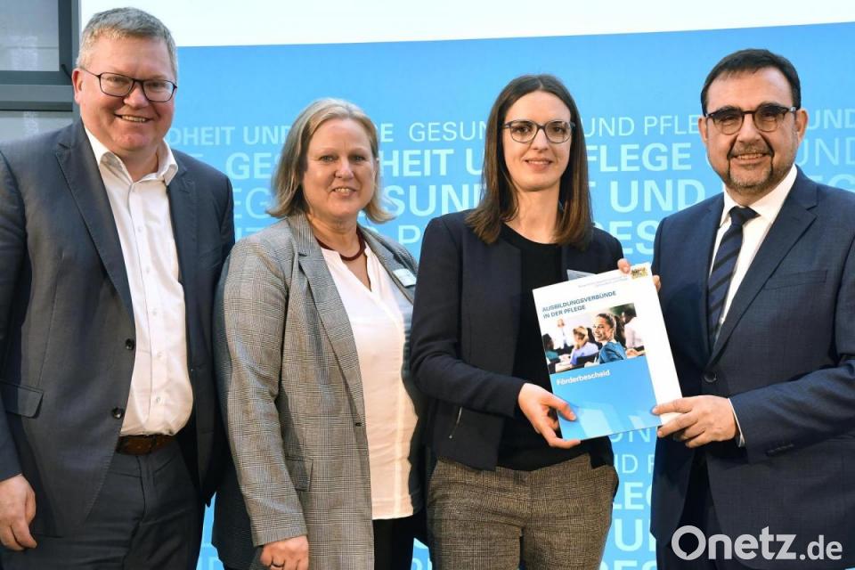 Pflegedirektorin Kerstin Wittmann vom Klinikum St. Marien und Christine Hecht von der Gesundheitsregion plus Amberg und Amberg-Sulzbach hatten am Freitag den kürzesten Anreiseweg. Sie bekamen einen von 25 Förderbescheide für den Ausbau der Ausbildungsverbünde in der Pflege. Dazu waren Gesundheitsminister Klaus Holetschek sowie viele Koordinatoren von Ausbildungsverbünden aus weiten Teilen Bayerns nach Amberg gereist. Die Übergabe erfolgte im Landesamt für Pflege in der Mildred-Scheel-Straße.