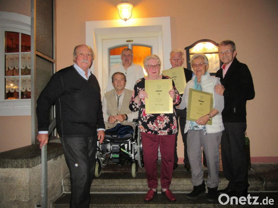 Vorsitzender Dieter Amann zeichnete Traudl Mirz für 55 Jahre, Josef Barth (50), Anna Barth und Karl-Heinz Kroher (jeweils 40) sowie Marlies Reich (25) aus. Nach dem gemeinsamen Abendessen und einer kurzen Weihnachtsansprache des Vorsitzenden gingen die Mitglieder zum besinnlichen Teil über, den das Duo Weiß mit Musik umrahmte. Bei Glühwein und Plätzchen klang der Abend aus. Auf dem Bild von links: Vorsitzender Dieter Amann, Karl Gröschl, Traudl Mirz, Josef und Anna Barth sowie Schriftführer Peter Hammer.