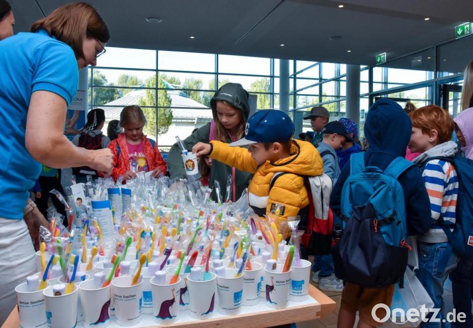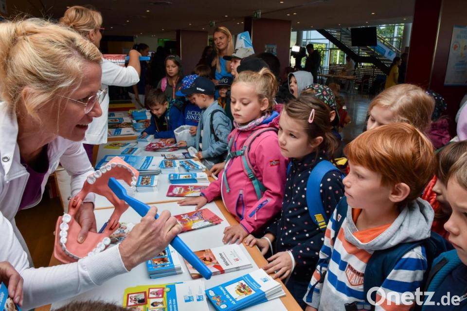 Eine Kollegin aus Schnaittenbach war für den Brotzeit-Check zuständig. Da durften die Kinder zeigen, was sie für die Pause dabei hatten und diese Snacks nach den Ampel-Farben Grün, Gelb und Rot ordnen. "Alle haben sehr gut mitgemacht", so das Resümee der Zahnärztin. Die Kinder drängten sich auch um einen weiteren Stand. Dort gab es gratis Kinderzahnbürsten. Klar, dass da kleine Kinderhände in der großen Kiste wühlten, um die Zahnbürste in der Lieblingsfarbe rauszufischen. Großen Erklärungsbedarf gab es an diesem Stand nicht – nachgefragt wurde höchsten wegen der Zahnseide. Im großen Saal sorgte ein Zauberer für heitere Momente.