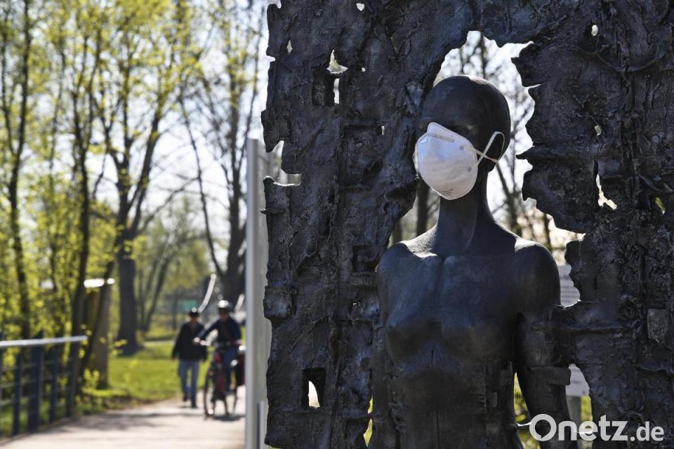 Gut geschützt blickt dieses Dame über ihr Reich am Plättenanleger bei der Bleichwiese. Obschon aus Bronze läuft sie jetzt nicht mehr Gefahr, sich mit dem Coronavirus zu infizieren. Objektion ist der Titel der Skulptur, die Hanna Regina Uber und Robert Diem für den Amberger Skulpturenweg geschaffen haben. Der ist derzeit übrigens gut besucht von Fußgängern und Joggern. Umso wichtiger ist ein wirksamer Schutz für das Gesicht.