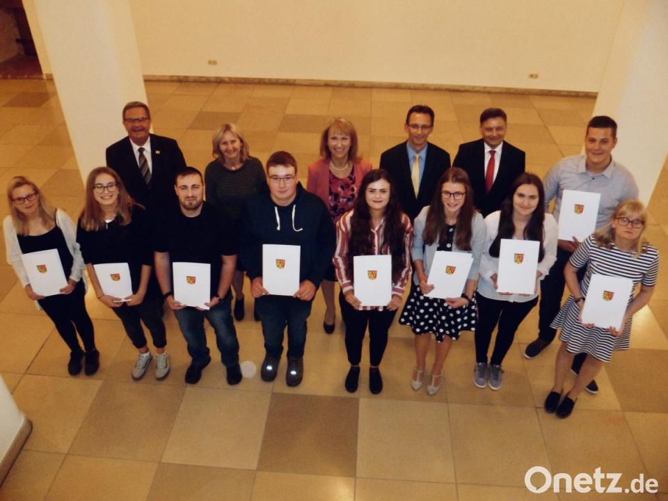 Der Zweckverband Berufsschulen Amberg und Sulzbach-Rosenberg, den Ambergs Zweiter Bürgermeister Martin Preuß vertrat, ehrte Lukas Baumer aus Sulzbach-Rosenberg, (Kfz-Mechatroniker Autohaus Widmann Amberg), Marianna Sperling aus Nürnberg (Fachangestellte für Arbeitsmarktdienstleistungen, Agentur für Arbeit Nürnberg), Katharina Pirzer aus Kümmersbruck (Industriekauffrau, Birner Kunststofftechnik Kümmersbruck) und Alexander Maschek (Fachlagerist aus Neukirchen, Kolping-Bildungswerk Cham).