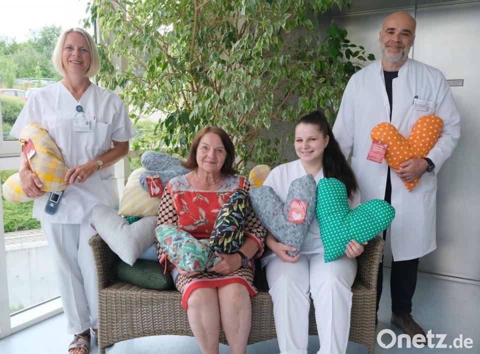 Es ist ein Herzenswunsch von Elfriede Auer, Brustkrebs-Erkrankte zu unterstützen. Seit 12 Jahren unterstützt sie Patientinnen des Klinikums mit selbstgenähten Herzkissen. „Mittlerweile dürften es 4000 Kissen sein, die ich zusammen mit meinen fleißigen Helferinnen Maria Kapperer, Ruth Kappl, Heidi Reich und Dagmar Syndar genäht habe“, freut sich Elfriede Auer. Nun hat sie samt ihren Helferinnen wieder 100 Kissen an das Klinikum überreicht. Der Chefarzt der Frauenklinik, PD Dr. Thomas Papathemelis, die stellvertretende Stationsleiterin der E2, Sabine Presl, sowie Pflegefachkraft Lea Zenger freuten sich sehr über die bunten Kissen.