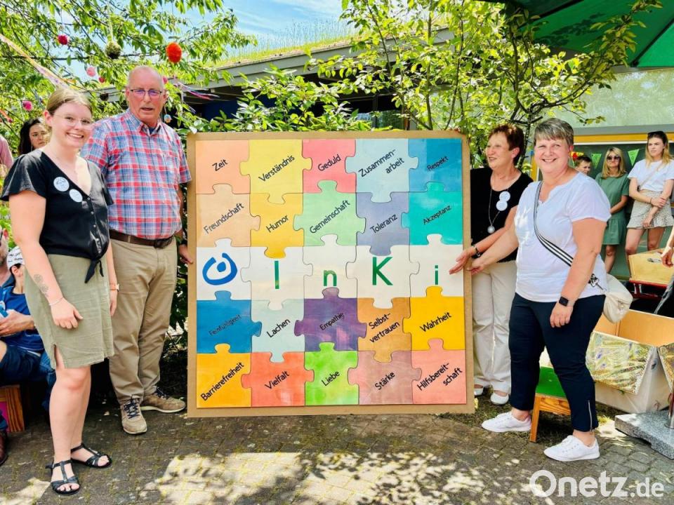 Spielerisch übernahmen die Kinder an diesem Tag das Kommando und präsentierten bei Gesang und Tanz, welche Rechte ihnen zustehen. Das große Puzzle, in das der neue Name eingebettet worden war, enthielt alles, was für inklusive Pädagogik wichtig ist: Liebe, Geduld und Freundschaft war dort zu lesen, aber auch Verständnis, Toleranz und Barrierefreiheit standen auf den Puzzle-Teilen. Einige davon fanden sich später an den Spiel- und Mitmachstationen wieder, die im Außengelände und im Kindergarten selbst verteilt worden waren. Attraktionen wie ein Auto-Kino, bei dem Filmsequenzen aus den vergangenen 20 Jahren Kindergarten gezeigt wurden, und eine Fotobox für bleibende Erinnerungen gehörten zu den Höhepunkten.