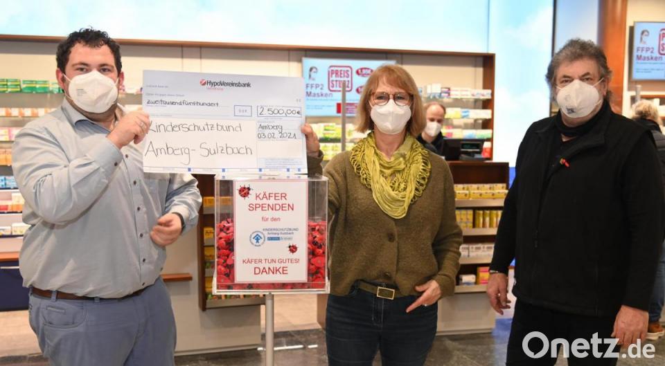 Seit Jahren schon erhalten Kunden in den Käfer-Apotheken in Amberg, der Apotheke St. Marien, der Bahnhofsapotheke und der MariPlus-Apotheke sowie der Marien-Apotheke in Sulzbach-Rosenberg bei ihrem Einkauf als kleines Dankeschön die Prämien-Marienkäfer. Diese kleinen roten Glückskäfer können in Prämien eingetauscht oder für soziale Zwecke gespendet werden, heißt es von den Apotheken. Die Apotheker-Familie Strobl zahlt für jeden gespendeten Glückskäfer 50 Cent und rundete das Jahresergebnis kürzlich auf 2500 Euro auf, die von den Apothekern Johann und Frederik Strobl an Brigitte Breitfelder, der Vorsitzenden des Kinderschutzbundes Amberg übergeben wurden. Die Marien-Apotheke in Sulzbach-Rosenberg wird ihren Glückskäfer-Ertrag in Höhe von 1200 Euro dem Tierschutzverein Amberg und Landkreis Sulzbach-Rosenberg zukommen lassen. Brigitte Breitfelder betonte, dass der Kinderschutzbund das Geld für die dringend notwendige Sanierung der sanitären Anlagen in der Kinderschutzbund-Geschäftsstelle in Amberg verwenden werde. "Wichtig ist uns", so Frederik Strobl, "dass unser Geld unbürokratisch ankommt und in der Region verwendet wird". Frederik Strobl gestattet sich noch den Hinweis, die vier Käfer-Apotheken hätten ausreichend CE-zertifizierte FFP2-Masken auf Lager, um die Versorgung in Amberg und im Landkreis sicherzustellen.
