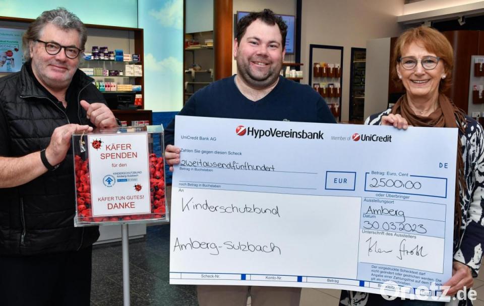 Familie Strobl macht gespendete Marienkäfer zu Geld und unterstützt damit Kinder, heißt es in einer Meldung der Apotheken an die Presse. In der Apotheke St. Marien, der Bahnhof-Apotheke und der MariPlus-Apotheke in Amberg sowie der Marien-Apotheke in Sulzbach-Rosenberg erhalten Kunden für ihren Besuch einen Prämien-Marienkäfer als kleines Dankeschön. Das ganze Jahr ist es möglich, die kleinen Glückskäfer gegen schöne, edle oder leckere Prämien einzutauschen oder für einen guten Zweck zu spenden. Seit Jahren werden die gespendeten Käfer gezählt und pro Exemplar mit 50 Cent vergütet. Den erhaltenen Betrag rundet Familie Strobl auf und überweist ihn lokalen gemeinnützigen Vereinen für einen guten Zweck. Die Amberger Käfer-Apotheken spenden das Geld dieses Jahr wieder an den Kinderschutz-Bund Amberg-Sulzbach. Wie bereits in den vergangenen Jahren können sich die Kinder auch dieses Jahr durch das Engagement der Amberger Käfer-Apotheken-Kunden über eine Spende in Höhe von 2.500 Euro freuen. Die Partner-Apotheke, die Marien-Apotheke in Sulzbach-Rosenberg, überreicht heuer insgesamt 1.500 Euro, je 500 Euro an das Tierheim Amberg-Sulzbach und an das Nest – Tierauffangstation in Kümmersbuch sowie 250 Euro an den Papageiengnadenhof Jackson in Sulzbach-Rosenberg.