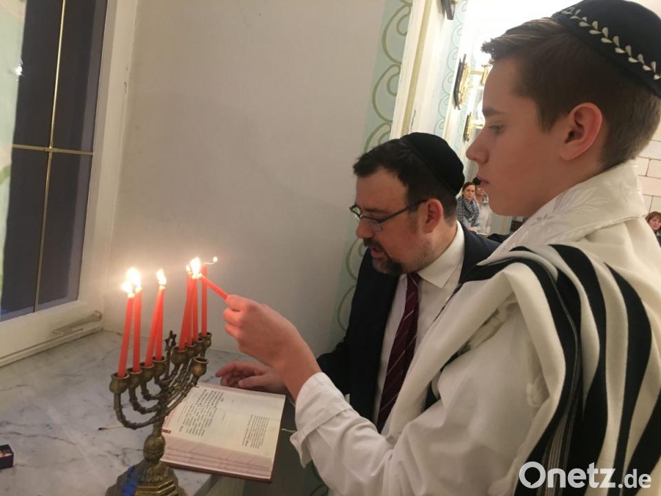 Daran erinnern die acht Lichter des Chanukka-Leuchters. Jeden Tag wird ein Licht mehr angezündet, bis am Ende alle brennen. Tatsächlich hat der Leuchter aber neun Arme oder Lichterhalter, das neunte Licht ist der Diener (hebräisch: Schamasch). Mit diesem werden die anderen angezündet. Während des Gebets in der Synagoge am Sonntagabend übernahm Noah, der im Mai seine Bar Mizwa gefeiert hatte, das Kerzenzünden. Im Anschluss gingen alle nach oben in den Gemeindesaal.