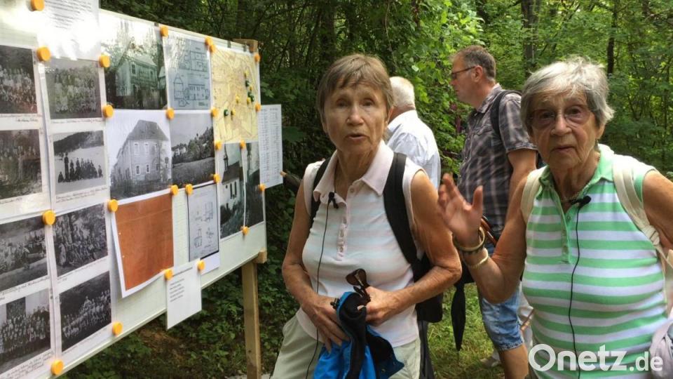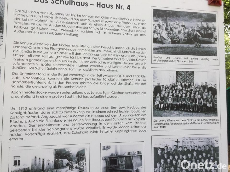 Ingrid Blodig und ihre Schwester Edeltraud Gleißner stehen vor einer der vielen Tafeln, die mit Texten und historischen Bildern an die Zeit erinnern, als Lutzmannstein noch ein sehr lebendiges Dorf war. Blodig zeigt auf ein Schwarzweiß-Bild – ein Klassenfoto. Sie ist die Vierte von links. Neun Jahre alt war sie, als sie, ihre zehnjährige Schwester Edeltraud und "die Mutti" Lutzmannstein verlassen mussten. Der Vater, eigentlich der Lehrer im Dorf, war damals im Krieg vermisst. Viele der alten Fotos, die zum Ehemaligentreffen gezeigt werden, stammen von ihm.