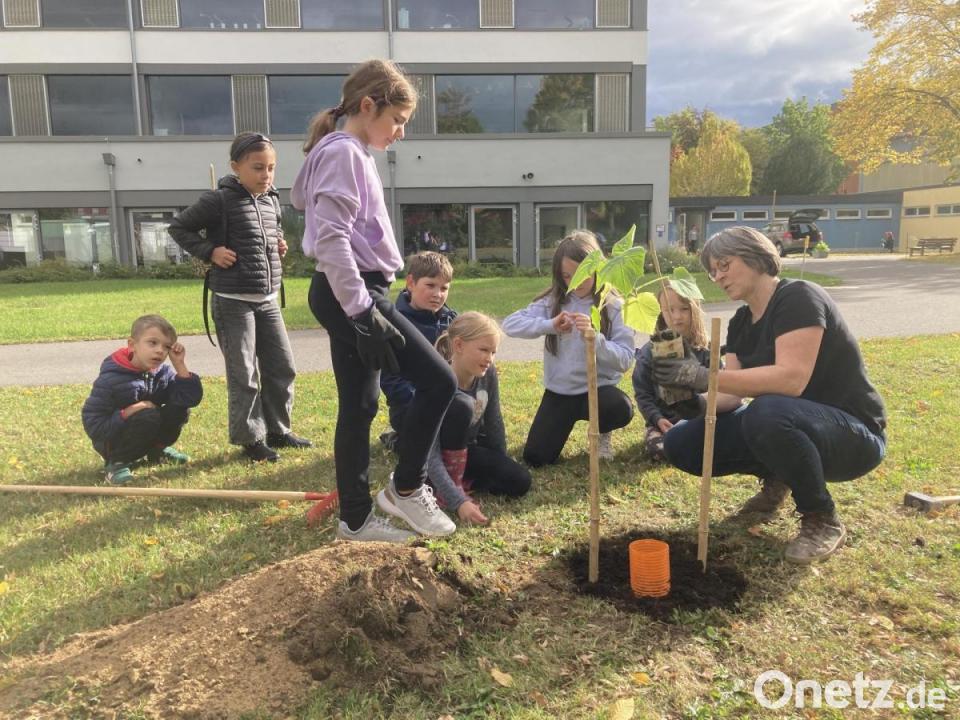 Kinder, Eltern und Lehrer der Albert-Schweitzer-Schule trafen sich an einem Samstag zu einer gemeinsamen Gartenaktion. Die vier grünen Pausenhöfe der Schule benötigen im Herbst viel Pflege. Gemeinsam wurden Hecken geschnitten, Unkraut gejätet, Laub gerecht und Rindenmulch aufgetragen. Der schuleigene Acker wurde abgeerntet. Die reichhaltige Ernte wie zum Beispiel Zucchini, Tomaten, Mais oder Kartoffeln wird von der Schulköchin in der Küche der Schule verarbeitet. „Was die Kinder angepflanzt, gepflegt und geerntet haben, dürfen sie als Schulspeise wieder genießen“, sagte Schulleiterin Marion Weigl. Auch die Pflege der Pausenhöfe und das Pflanzen der Bäume diene der Erziehung zur Wertschätzung ihres Umfeldes und zur Nachhaltigkeit. Heuer wurden sogenannte "Klimabäume" gepflanzt. Gemeinsam mit Martina Dietrich setzten die Kinder der Albert-Schweitzer-Schule Kiribäume in die Erde. Der Kiribaum ist der am schnellsten wachsende Baum der Welt. Im Frühjahr trägt der Kiribaum blaue glockenförmige Blüten, weshalb er in Deutschland auch Blauglockenbaum genannt wird. Seine Blätter sind essbar. Sie schmecken ähnlich wie Spinat. Da der Kiribaum bis zu zehn Meter hoch wird, eine fünf mal fünf Meter große Baumkrone und große Blätter hat, soll er in den heißen Monaten als natürlicher Schattenspender dienen.