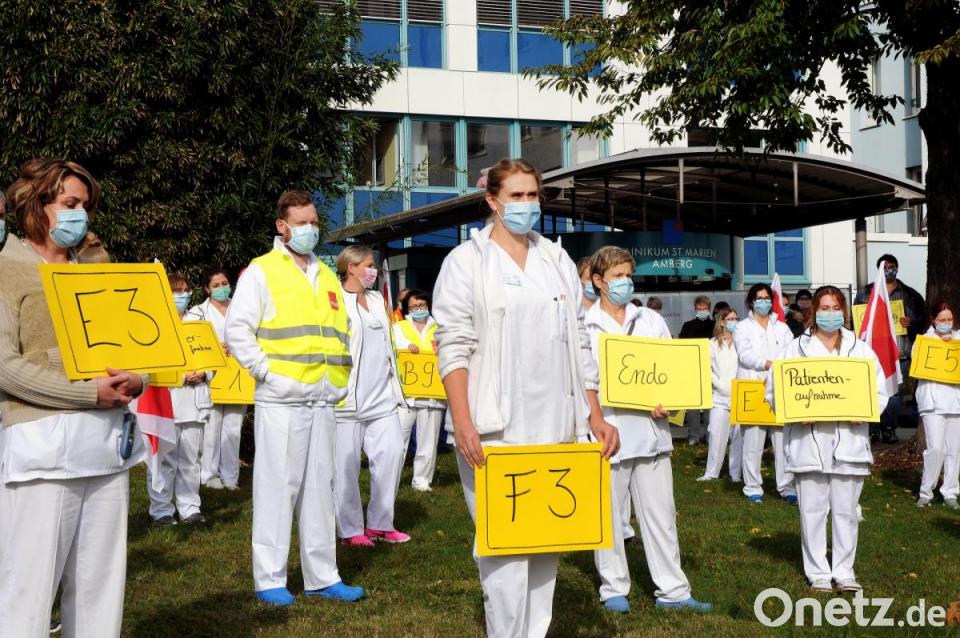 Arbeitskampf klingt etwas zu martialisch für die Form der Auseinandersetzung, die die Mitarbeiter des Amberger Klinikums gewählt haben. Sie brachten ihre Position in einer "Aktiven Mittagspause" auf der Wiese vor dem Haupteingang zum Ausdruck, coronakonform und patientenfreundlich - mit Masken und Abstand, per Delegierte aus den einzelnen Stationen und nicht einmal eine halbe Stunde lang. Das zeigt laut Verdi-Vertrauensmann Reinhard Birner, wie verantwortungsvoll die Beschäftigten am Krankenhaus mit der Forderung nach einer angemessenen Entlohnung umgehen, gerade jetzt, wo die Coronazahlen auch in Amberg wieder ansteigen.