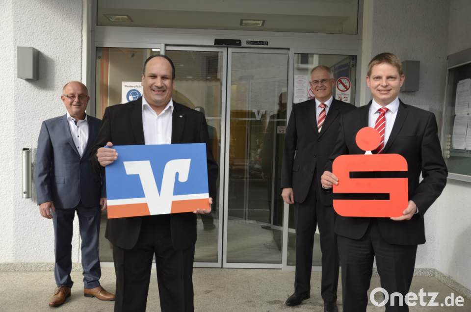 Sie arbeiten künftig zusammen (von links): Norbert Waldhauser, Vorstand der Raiffeisenbank Hirschau, Geschäftsstellenleiter Hans-Peter Schmid sowie Alexander Düssil, Vorstandsmitglied der Sparkasse Amberg-Sulzbach, und Geschäftsstellenleiter Dominik Merkel.