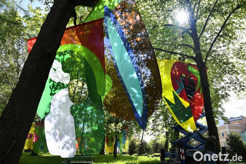 Windsbräute heißen diese großformatigen Kunstwerke. 13 Stück, zwischen 4,70 und 6,20 Meter lang, wurden am Donnerstag unter Regie von Ina Bogner vom Amberger Stadtmarketing in die Bäume hinter dem Pavillon im Englischen Garten gehängt. Ganz bewusst nicht zu weit vom Boden weg, wie Bogner anmerkte: Die Künstlerin habe sich gewünscht, dass man unter den Fahnen durchgehen und sie dabei bewusst erleben kann. Diese großformatigen Kunstwerke sind nicht zum ersten Mal in Amberg zu sehen – zur Luftnacht 2016 hatten sie ihre Premiere im Englischen Garten. Künstlerin Beate Oehmann hat die Windsbräute dem Luftmuseum geschenkt, das sie jetzt in Zusammenarbeit mit dem Stadtmarketing wieder im Grünen präsentiert. "Mir gefällt's super", sagte Ina Bogner, als als Fahnen aufgehängt waren und zwischen den Bäumen flatterten, begleitet von Sonnenschein und Vogelgezwitscher: "Da läuft man durch wie in einem Werbespot."