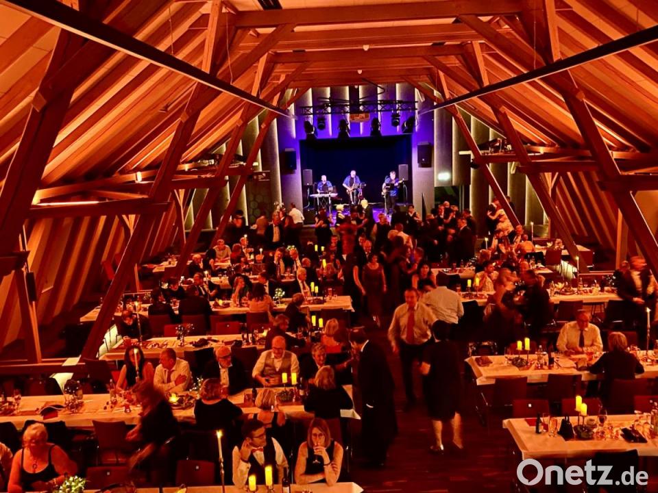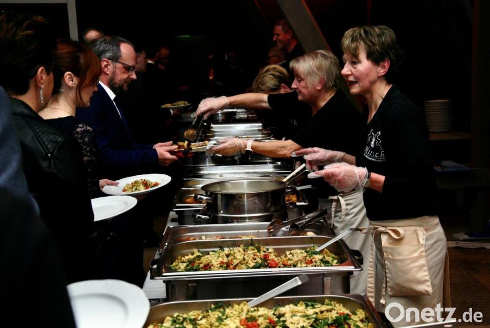 Doch zuerst mussten sich die rund 170 Gäste aus Politik, Wirtschaft und Kultur für die über sechsstündige Marathon-Party stärken. Der Catering-Service der Metzgerei Hirsch kredenzte ein dreigängiges Menü, bestehend aus einer deftigen Petersilienwurzel-Cremesuppe, Hähnchenbrustfilet oder Krustenbraten vom Strohschwein und als Nachtisch Panna Cotta oder Mousse au chocolat.